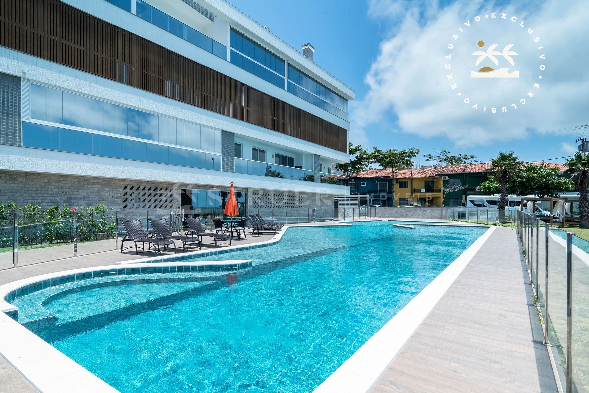 - O condomínio fica de frente para o mar na Praia de Bombas, com piscina e solário para momentos de lazer.