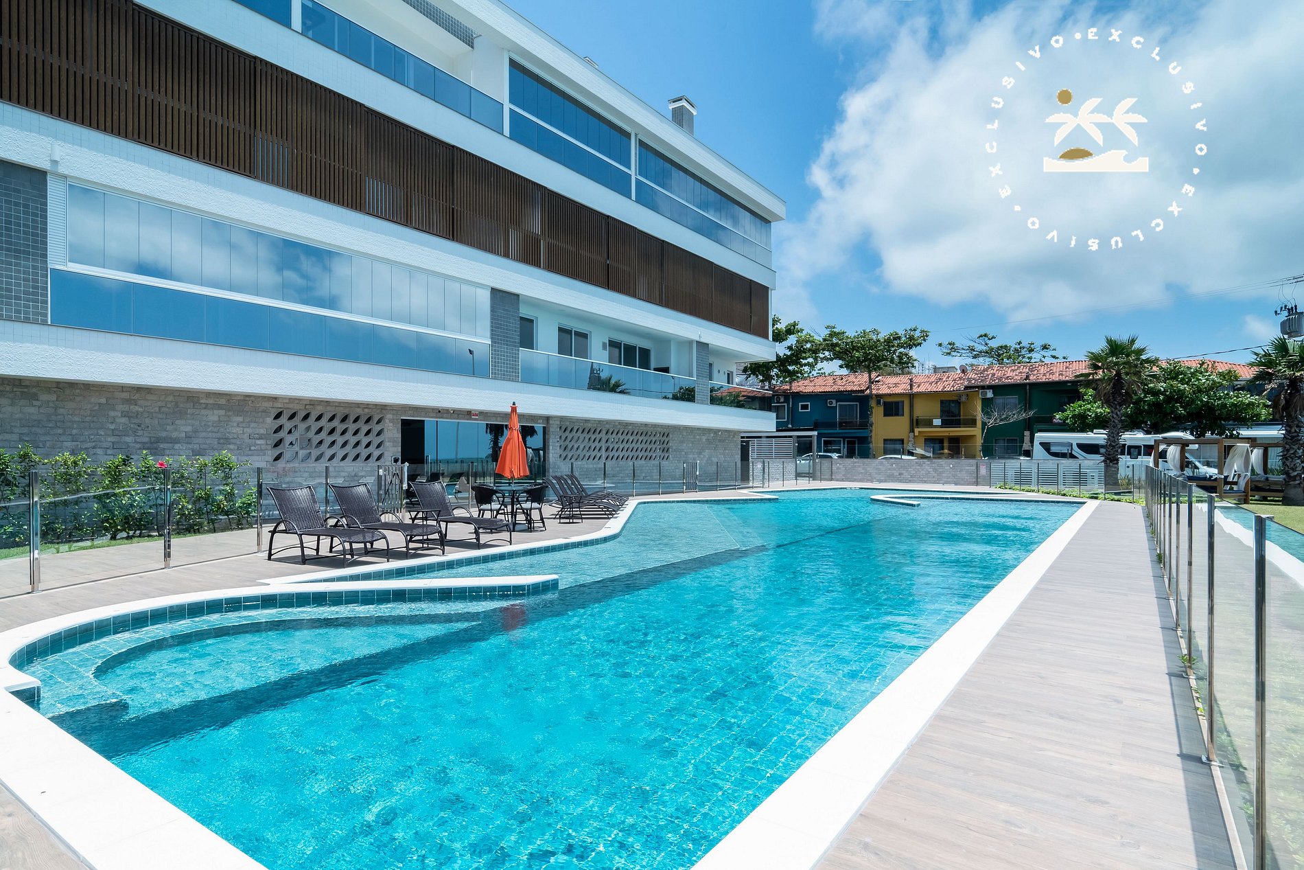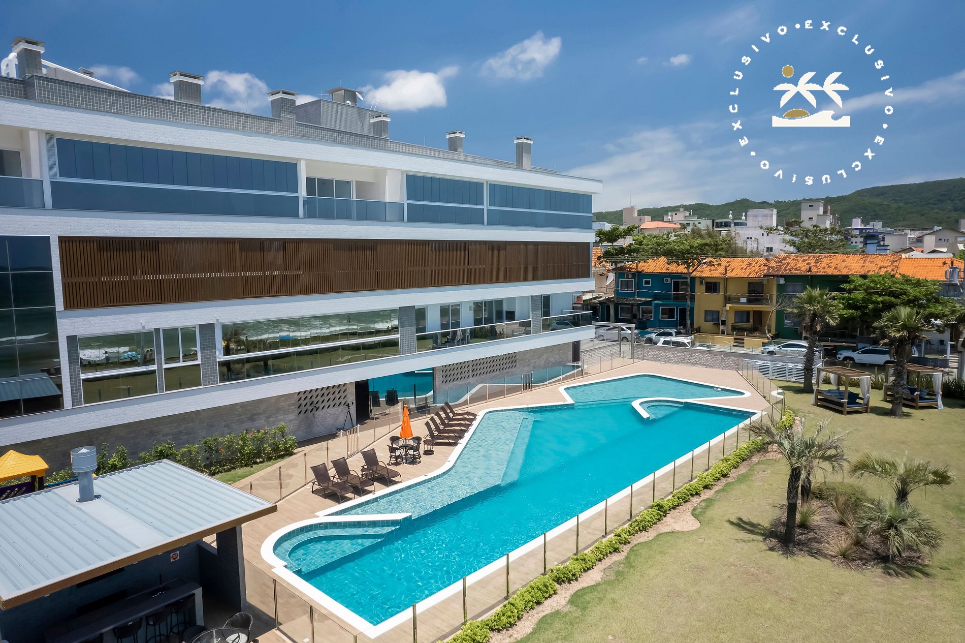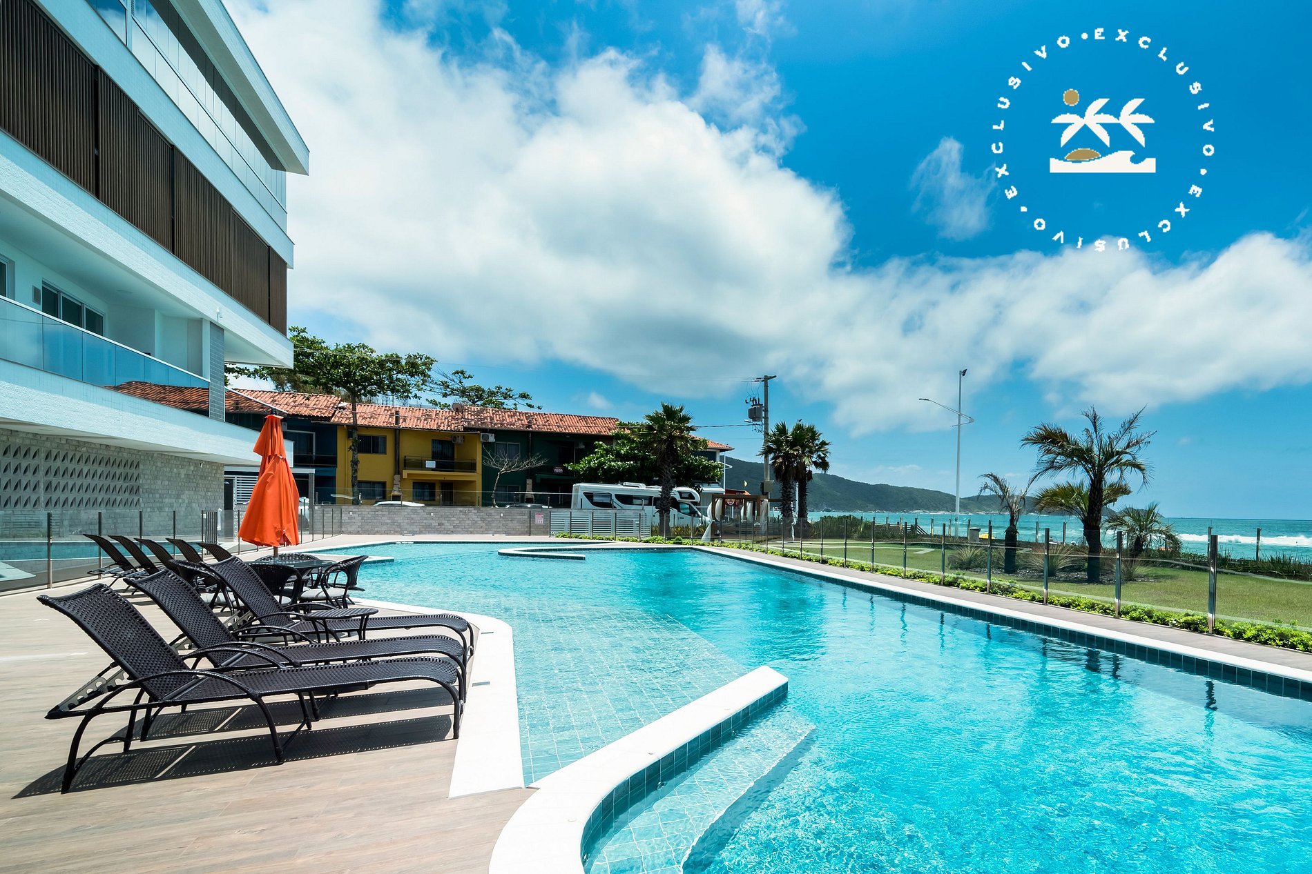 - O condomínio fica de frente para o mar na Praia de Bombas, com piscina e solário para momentos de lazer.