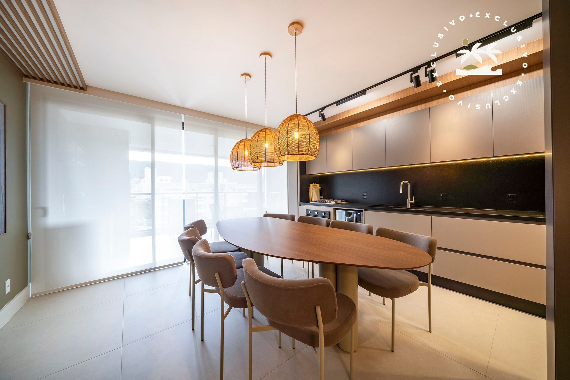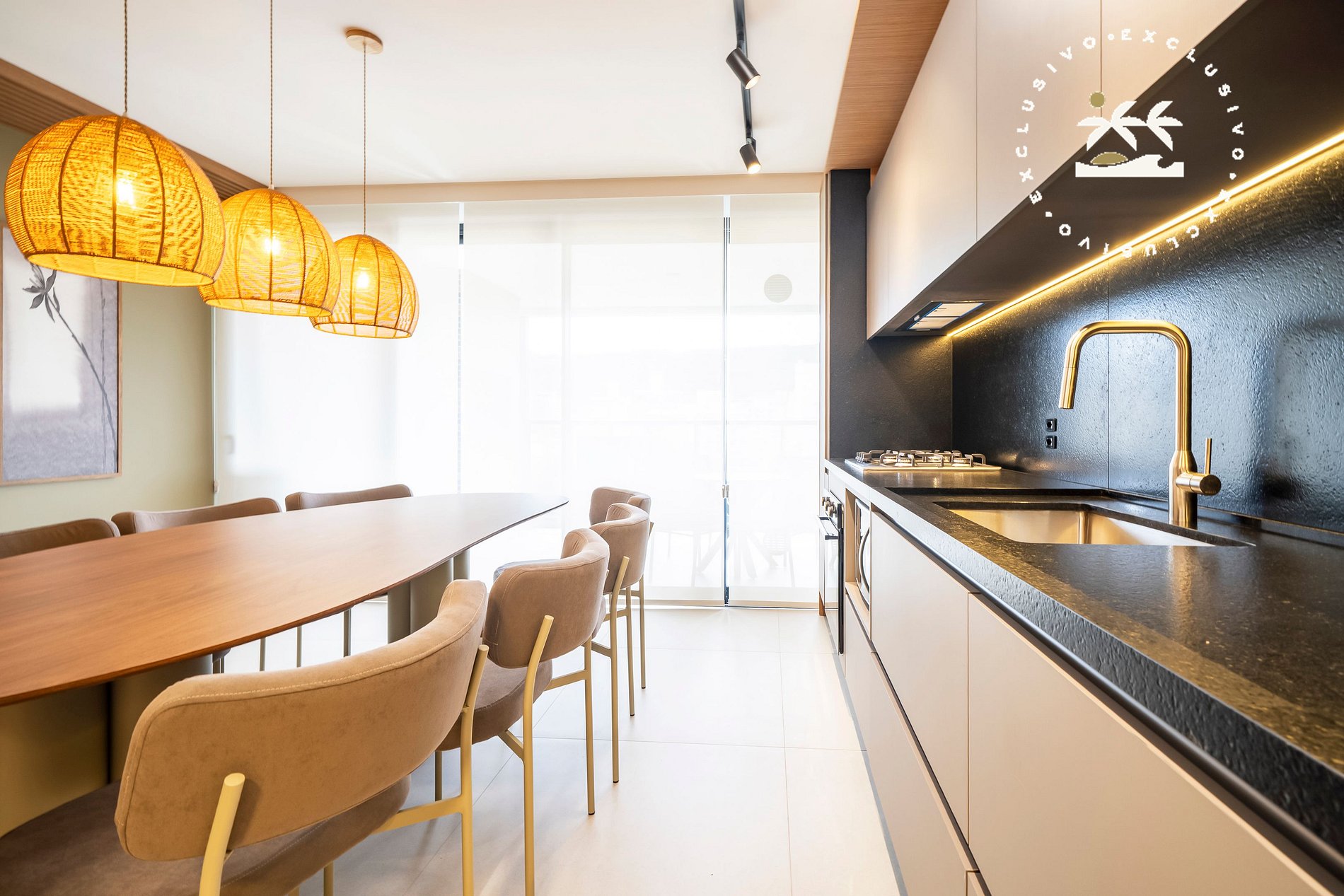 Mesa de jantar entre a cozinha e a sala;