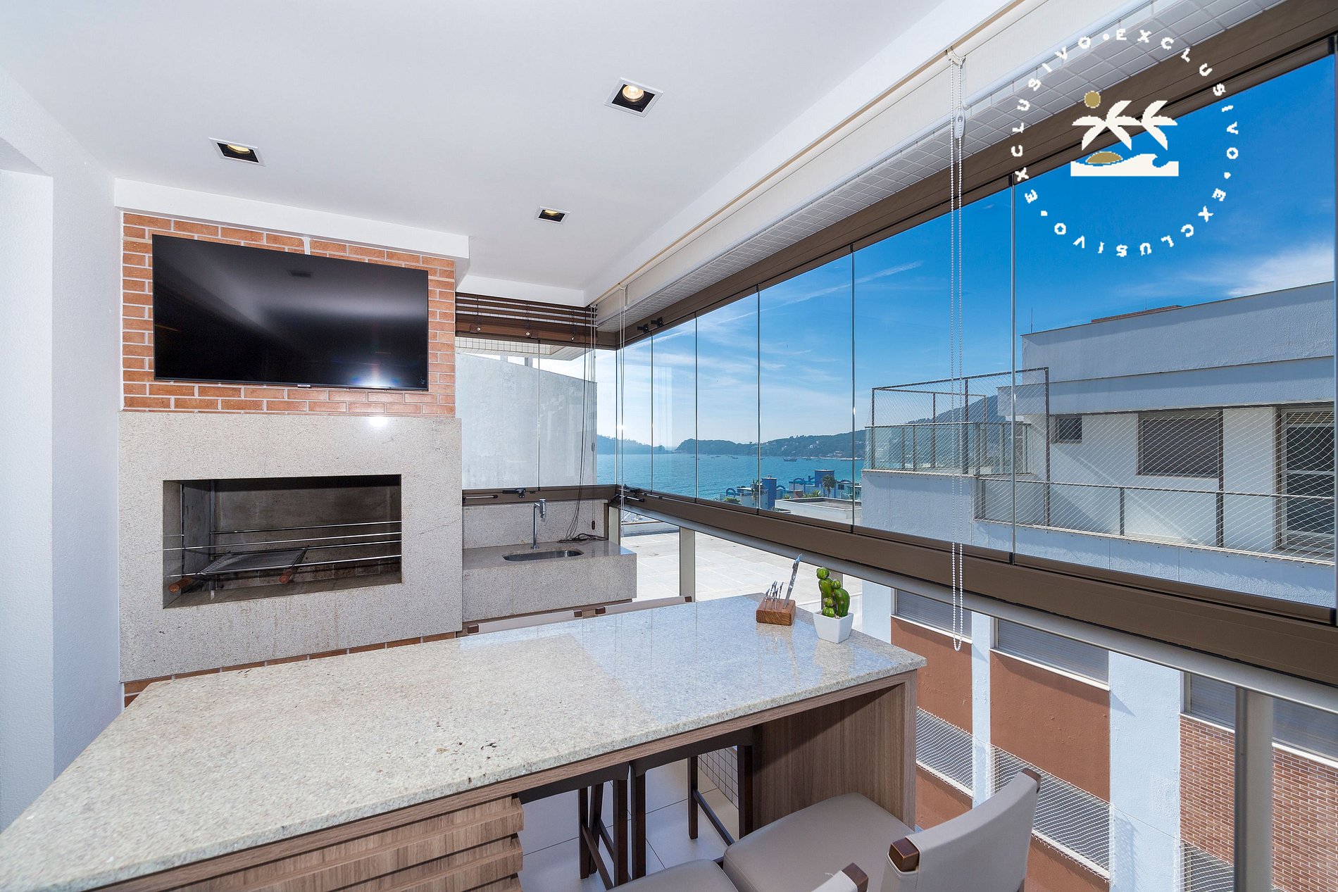 - Sacada com churrasqueira e vista para o mar.