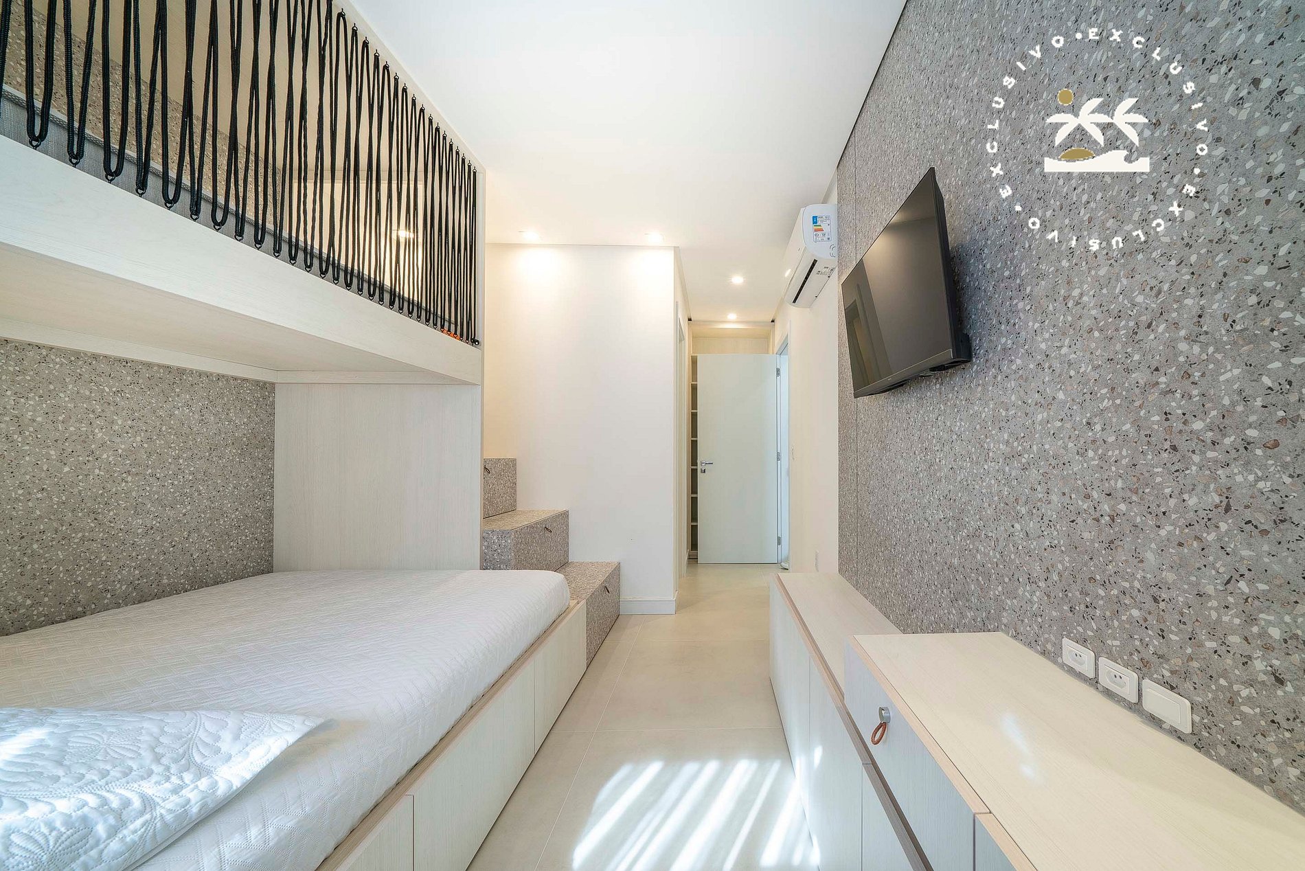 - 01 suíte com cama de casal, com uma cama de solteiro em cima (modelo beliche)